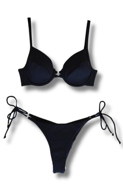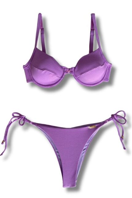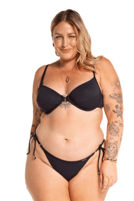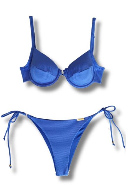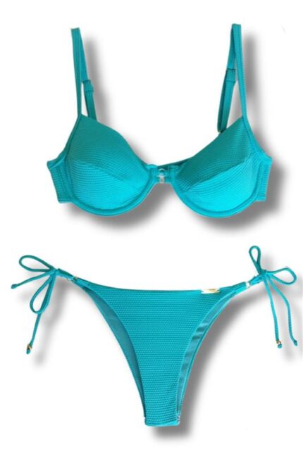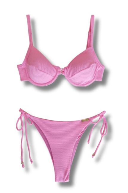 Top biquíni tecido colmeia com bojo removível e aro, detalhe com duas argolas no meio, alças reguláveis, costas e pescoço de amarrar.