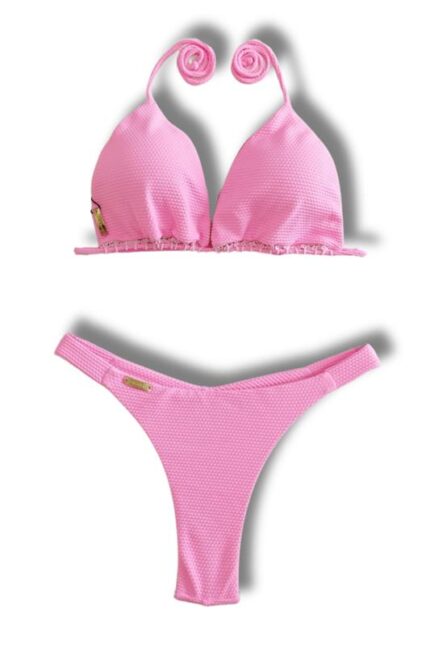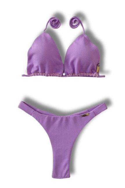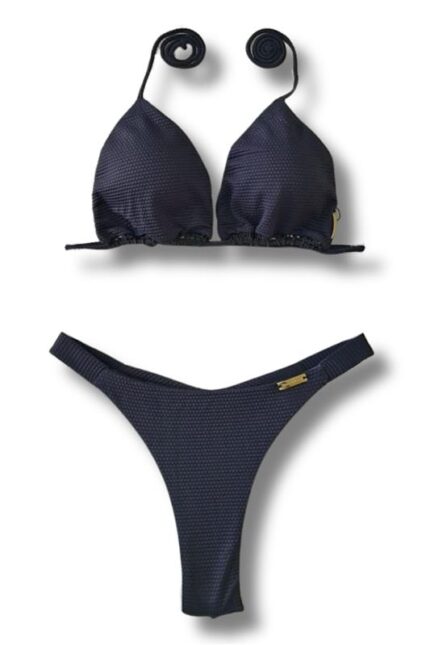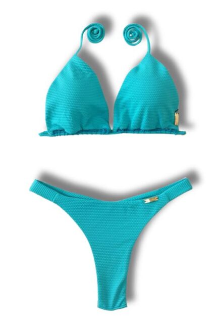 Top biquíni tecido colmeia cortininha de correr com bojo removível, detalhe de crochê de amarrar nas costas e no pescoço.