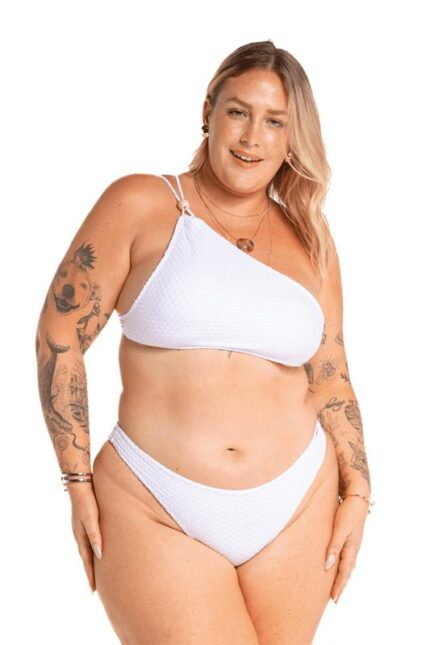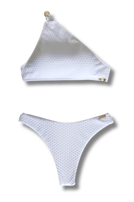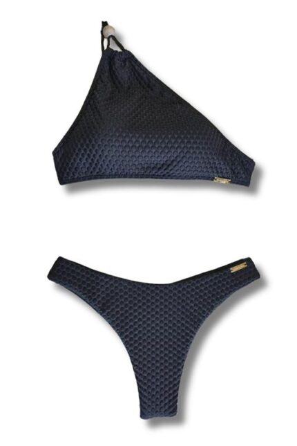 Top biquíni tecido bublle com bojo, de um ombro só, com detalhe de bola no ombro, de amarrar nas costas.